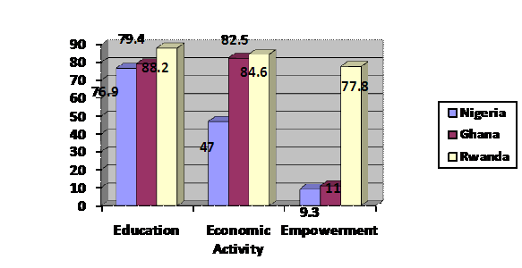 The index measures gaps in three dimensions education, economic activity and empowerment in relation to participation in decision making. Each score carries a maximum score of 100. Fig. 1 compares the scores of Nigeria (44), Ghana (58) and Rwanda (84) for each indicator. They demonstrate that Nigeria lags behind the other two countries in all three dimensions and underscore the extent of female poverty and exclusion in Africa’s most populous nation (Social Watch, 2009).